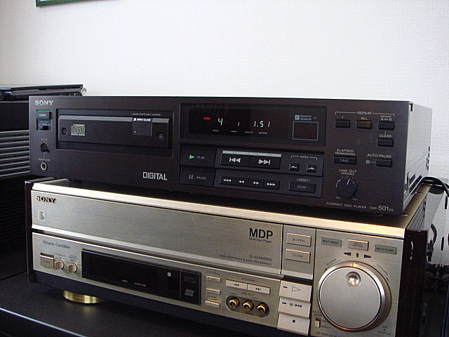 最後にメインシステムに接続してみました。最近は写真のMDP-999で再生する音を比較に使いますが、MDP-999は高音と低音ともしっかりとした再現性がありレンジも広いです。CDP-501ESはそれと比べると低音域で弱い感じがあり、若干低音が弱い感じで音もいかにもデジタル音という感じのシャープな感じがします。