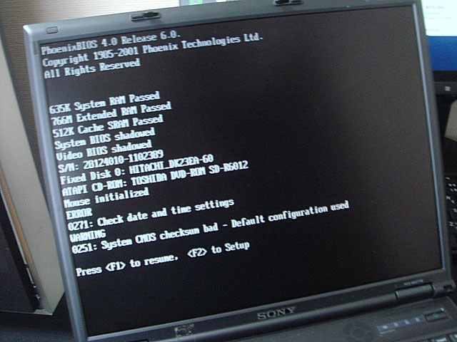 電源を入れてみました。BIOSは起動しましたがHDDは認識していない様子。