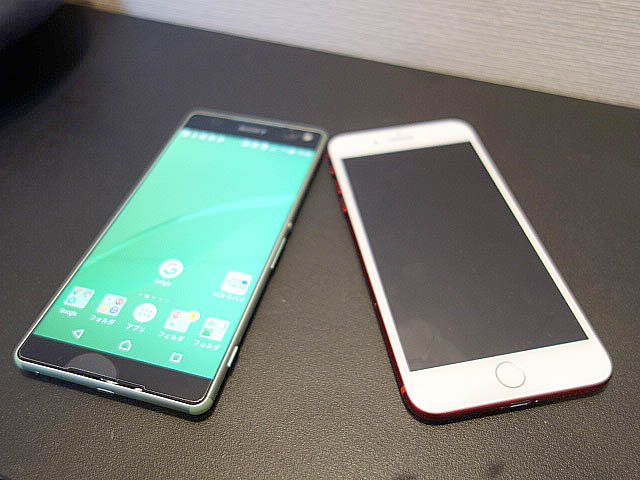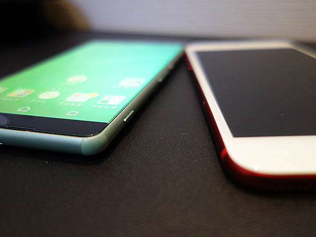 厚さもほぼいっしょ。OSの違いとCPUスペックの差があるので比較は難しいですがC5の質感も負けていません。iPhone以上に全面のベゼルレスデザインは今でもいい感じです。動きのレスポンスはiPhone7がやはり一枚上。
