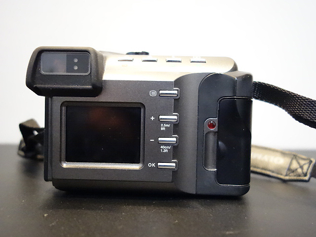 背部になります。右側にメニューボタン、カーソルボタン、OKボタンがあり、更に右側はスマートメディアの挿入スロット。 左側はファインダーと液晶モニター。一眼レフなので当然ファインダーからの撮影になりますがフォーカスの確認ができないフレーミング専用。