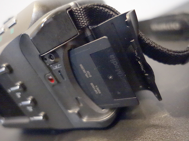 記録媒体は今では見かけなくなったスマートメディア。薄いのがメリットですが電気的な接点部(接触部)が露出していて経年劣化してくると読取りエラーが起こりやすい。また容量にも限界や互換性の問題があり普及しませんでした。