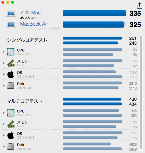 ベンチマークです。Airはcore i7 メモリ8GBです。3年前のハイスペックと現行のローエンドがほぼ同じという結果。