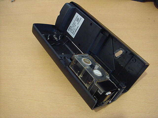 内部です。液晶部(ユニット部)と電源(単4、4本)、インクリボンとプリンターのヘッド部の構成となっています。