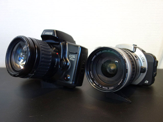 画質に関してはなかなか評価が難しく本機の購入前にはEOS10QDを使っていましたが少なくとも10QDのほうが色の再現力は高かったと記憶しています。EOS10QDと並べてみましたがIX Eとのデザインの違いが分かると思います。金属フレームとシンプルなデザインは近未来的でこの新しいカメラデザインは当時では画期的でした。