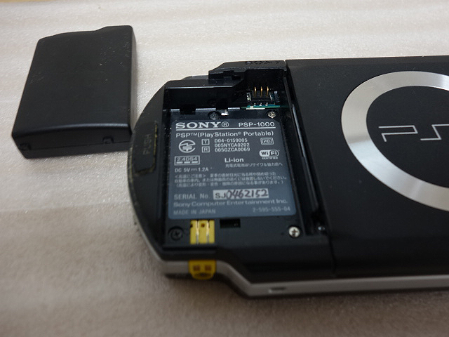 背部、左はバッテリ、中央はUMDドライブ、右はメモリースティックDuoスロット。