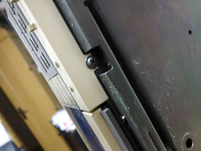 次に窓部分のユニットを外します。右側はネジ1本。この時にプラスチック製スッチが衝撃等を加えると経年劣化で折れやすいので注意が必要です。