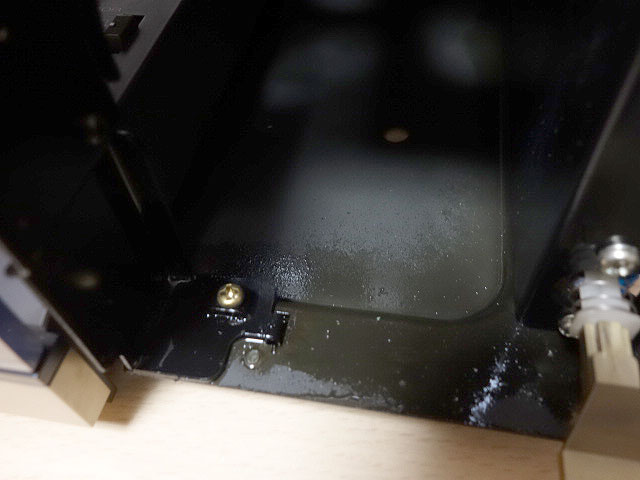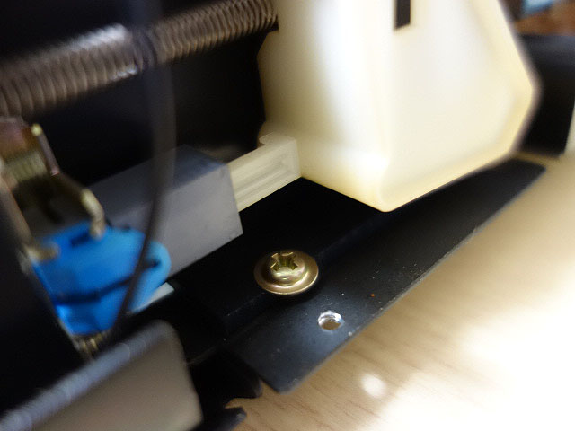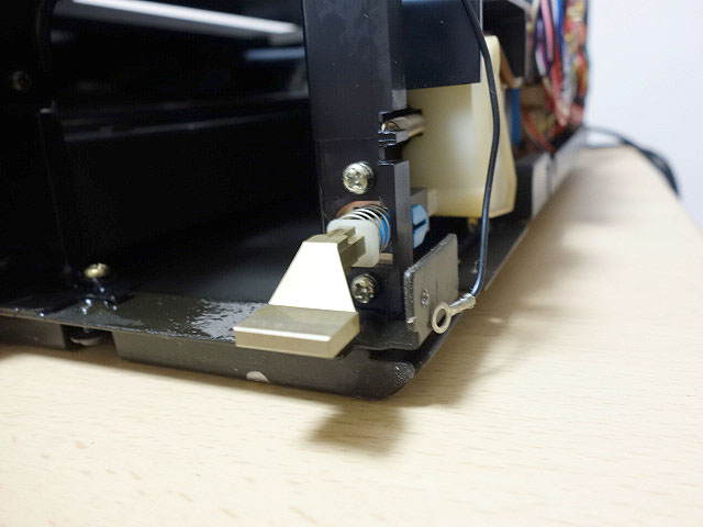 右側電源スイッチ部の下にテーブルと本体を固定しているネジを外します。