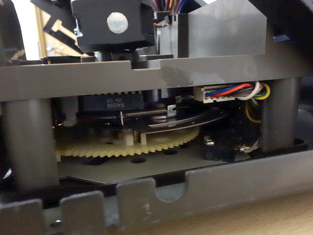 問題はアーブ部の可動。とりあえずさらに分解していきます。アーブ部のモーター部を保護しているカバーを外します。(ネジ2本)