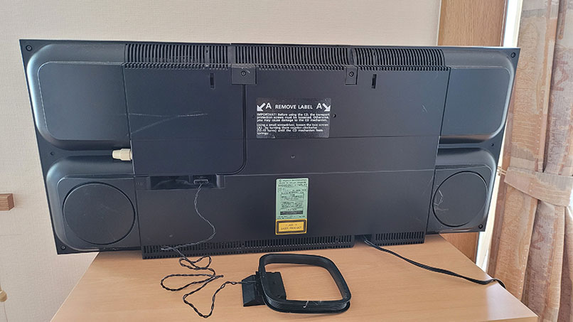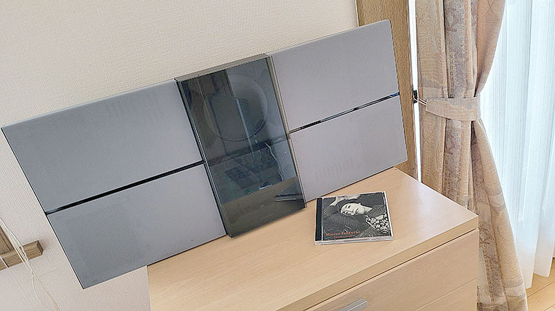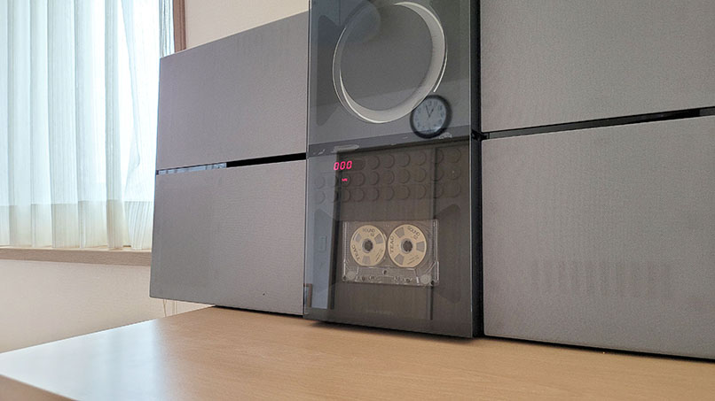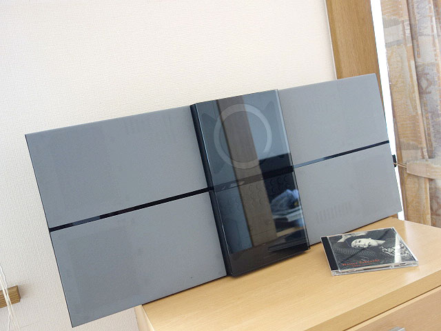 中心にデバイス(CD、カセット、操作系)を置き、左右に大型のスピーカーを配置している一体型音楽システムでいわゆるラジカセ型。