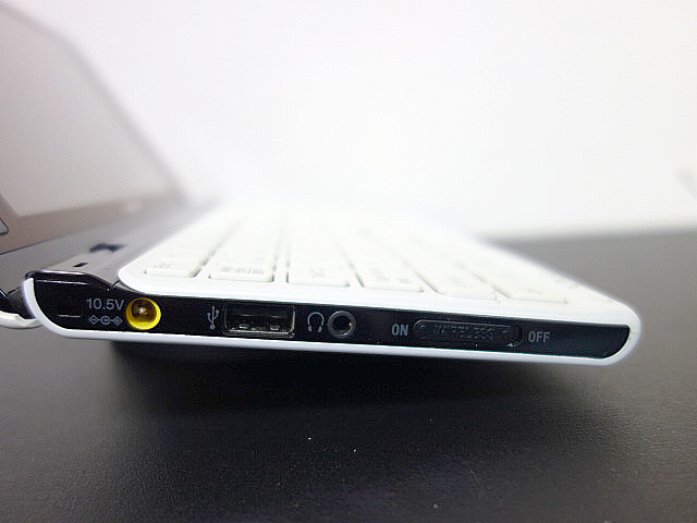 本体左側。左から電源コネクター、USB、ヘッドホン、無線機能スイッチが並ぶ。