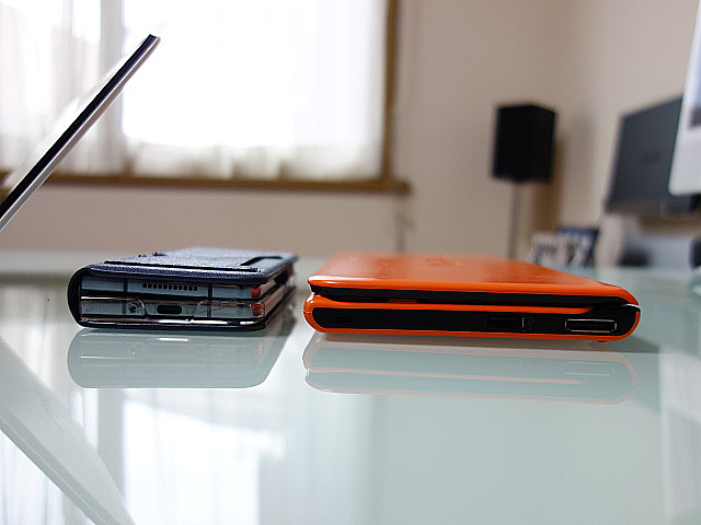 普段使用しているGalaxyFold4と並べてみました。シェイプアップされている本体の薄さがわかります。