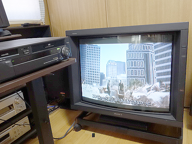VHSテープを再生してみましたが、Hi-8は水平解像度400本前後ありますが、ノーマルのVHSは240本前後なので34inchモニターではソフトな映像になります。
