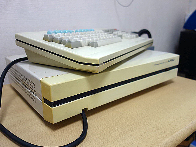 本体の寸法は幅450×奥行310×高さ85mmと大きめ、キーボード部は幅450×奥行220.5×高さ71mmとこれも重厚感のあるキーボードです。両者ともにクリームホワイトで統一されており、デスクに並べたときの統一感と清潔感は、当時の国産PCとしては際立ったものでした。